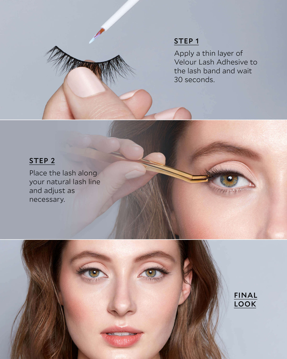 Option B: Using Velour Lash & Go Eyeliner: Starting with one eye, apply from inner to outer corner of the lash line. Apply the false lash while the eyeliner is still wet.