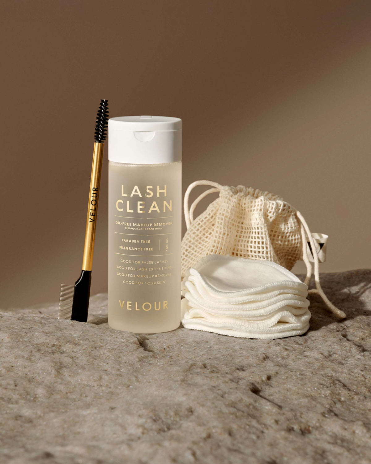 This eyelash cleaning bundle includes a Full-Size Lash Clean, our Too Clean Lash Wand and our Reuse Me Cotton Pads.