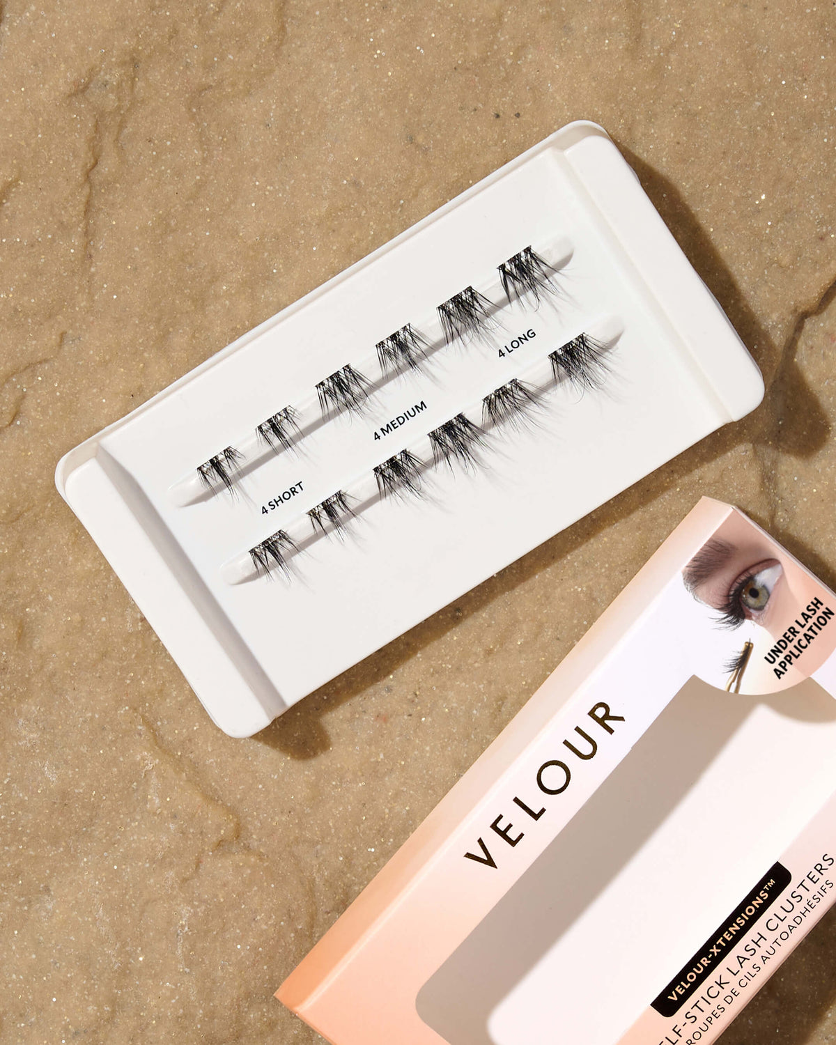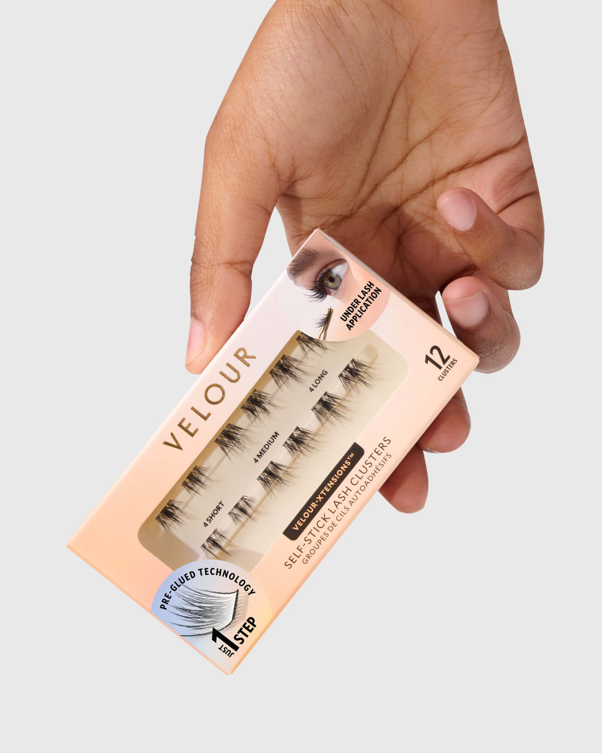 Lash application in just 1 step with our pre-glued technology! Perfect for beginners, these self-adhesive lash clusters are easy to apply and mess-free.​ Handmade with lightweight and natural-looking fibres, Velour Self-Stick Lash Clusters are applied underneath your natural lashes for a seamless look. Use 3 clusters per eye for a full lash extension look, or 1-2 clusters to create a half lash.