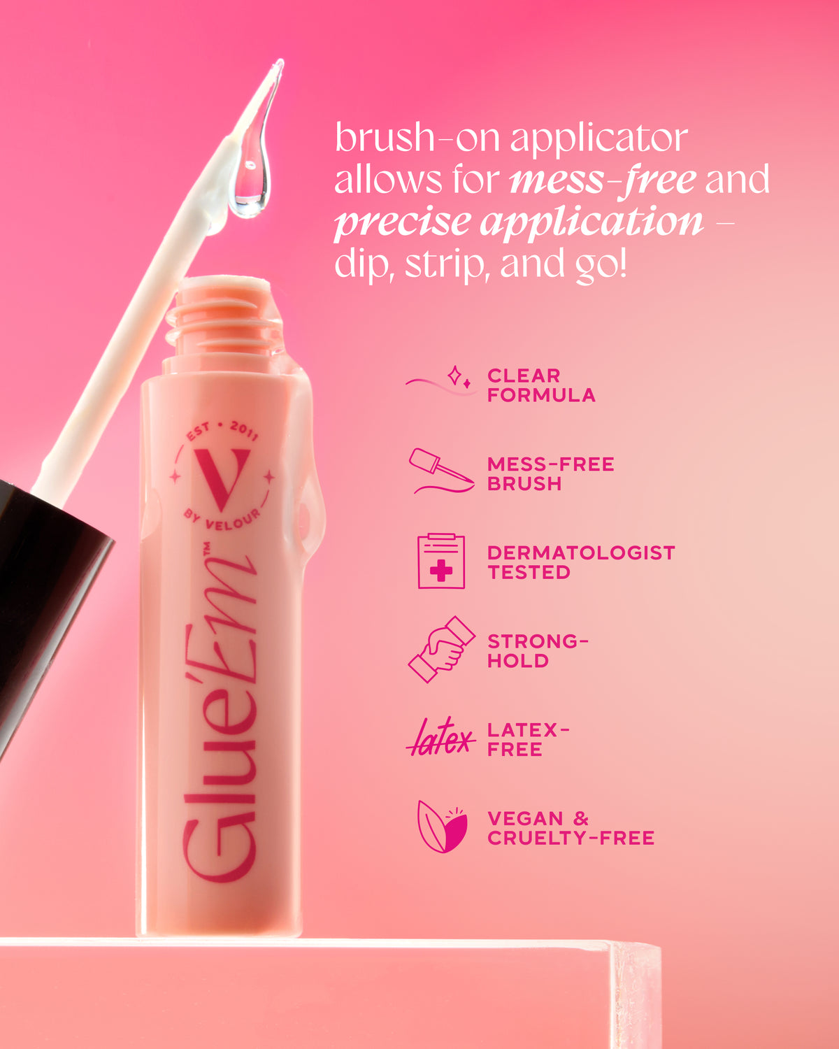Glue 'Em™ is a clear lash glue designed with a beginner-friendly brush-on applicator for mess-free and precise application - just dip, strip, and go! The strong-hold formula makes the perfect lash adhesive for any occasion - pair with your favorite V by Velour lashes! And we’ve done the dirty-work - Glue 'Em™ is a dermatologist tested, latex-free, and formaldehyde-free formula.