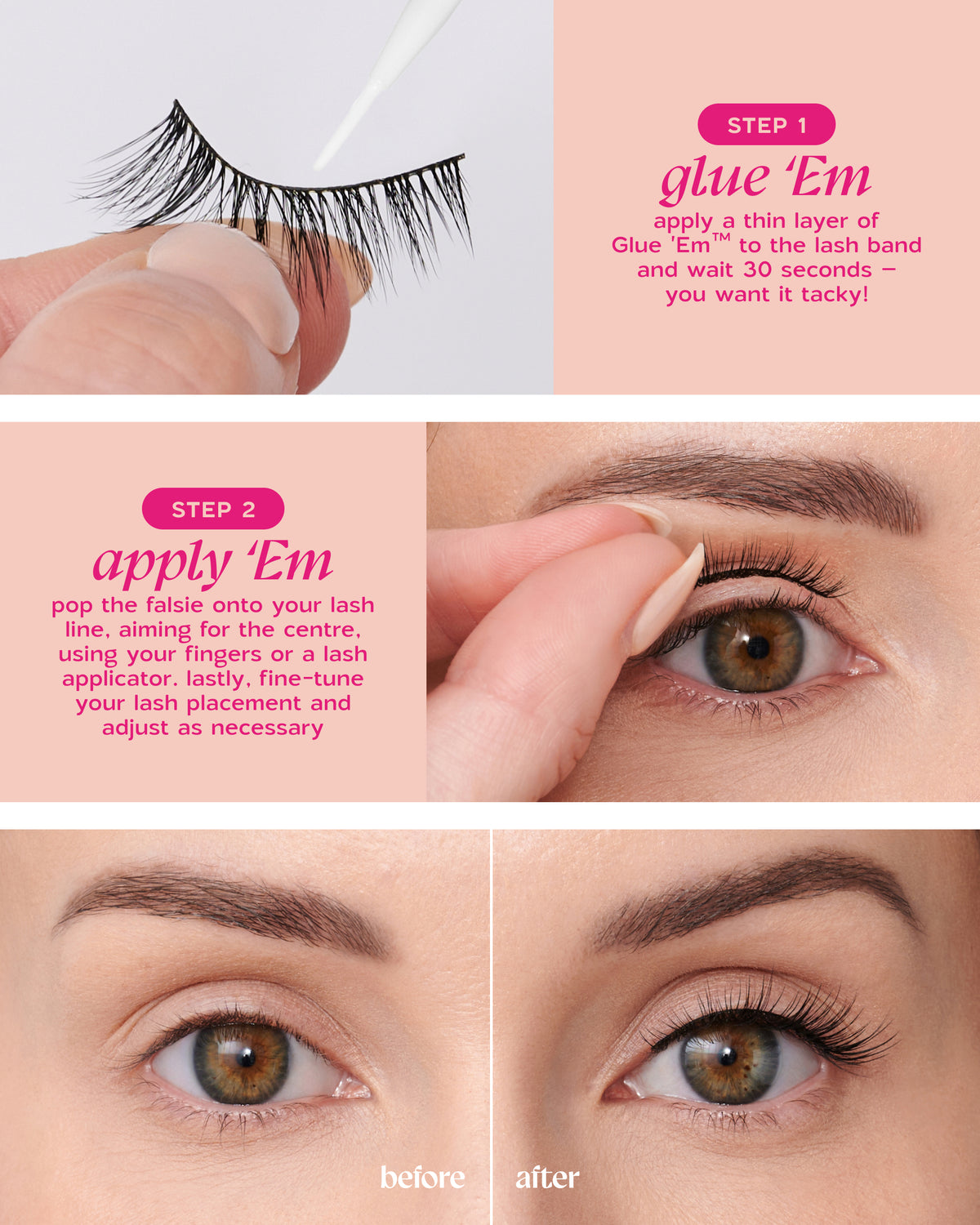 Pop the falsie onto your lash line, aiming for the centre, using your fingers or the Too Easy Lash Applicator. Lastly, fine-tune your lash placement and adjust as necessary.