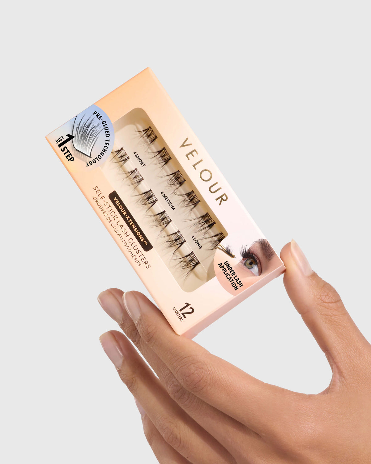 Lash application in just 1 step with our pre-glued technology! Perfect for beginners, these self-adhesive lash clusters are easy to apply and mess-free. Handmade with lightweight and natural-looking fibres, Velour Self-Stick Lash Clusters are applied underneath your natural lashes for a seamless look. Use 3 clusters per eye for a full lash extension look, or 1-2 clusters to create a half lash.