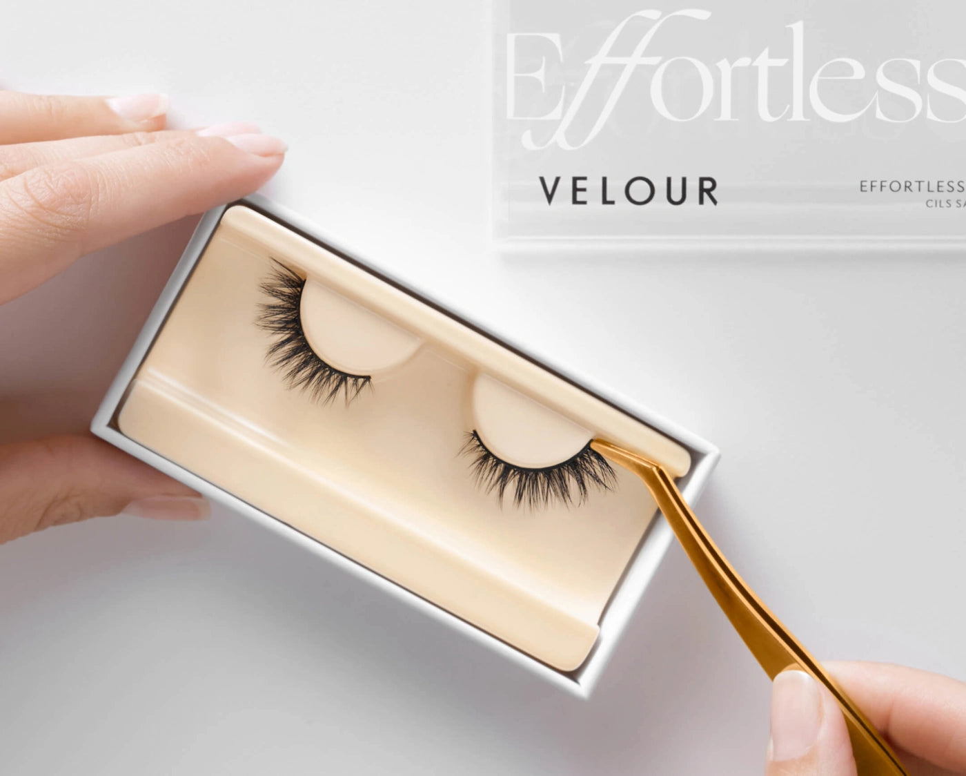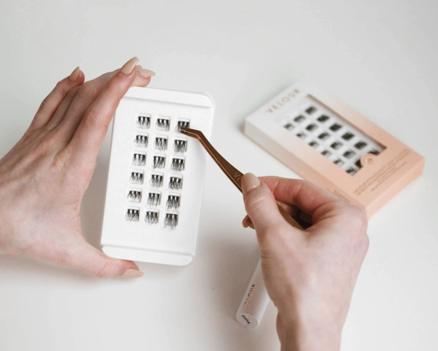 Always be gentle, especially when removing Velour-Xtensions™ Lash Clusters from the box for the first time. Using the Velour Too Real Lash Extension Tool, gently peel the clear band of the lash cluster out of the box, from one corner to the other. Do not pull on the lash fibres. Do not force.