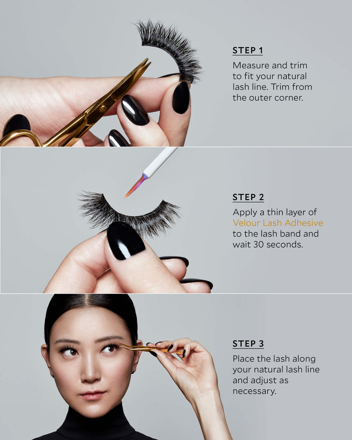 Apply Velour Lash Adhesive to a lash band and allow 30 seconds for adhesive to become sticky. Once sticky, apply lashes to your lash line and adjust as necessary.