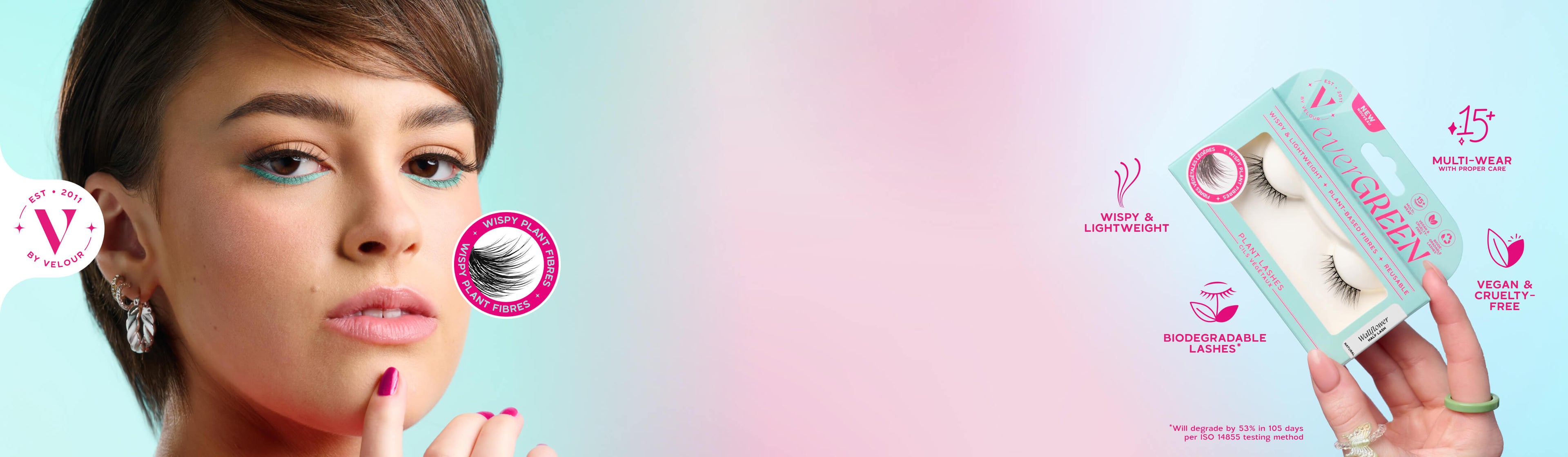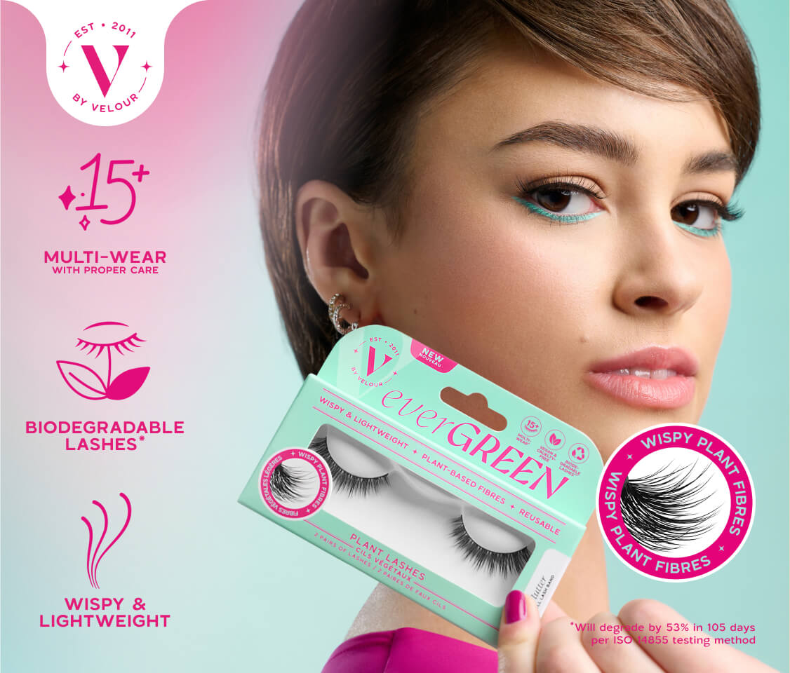 Weightless, wispy and oh-so natural, V by Velour everGREEN Lashes are made with biodegradable* plant-based fibres for a natural look and lightweight feel. Vegan, cruelty-free and reusable, these planet-positive lashes will make you feel as good as they look.